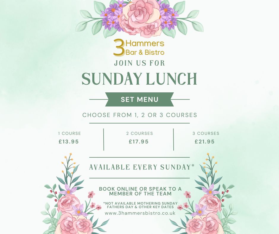 Follow us on Facebook @3hammersbistro for our opening times and latest offers